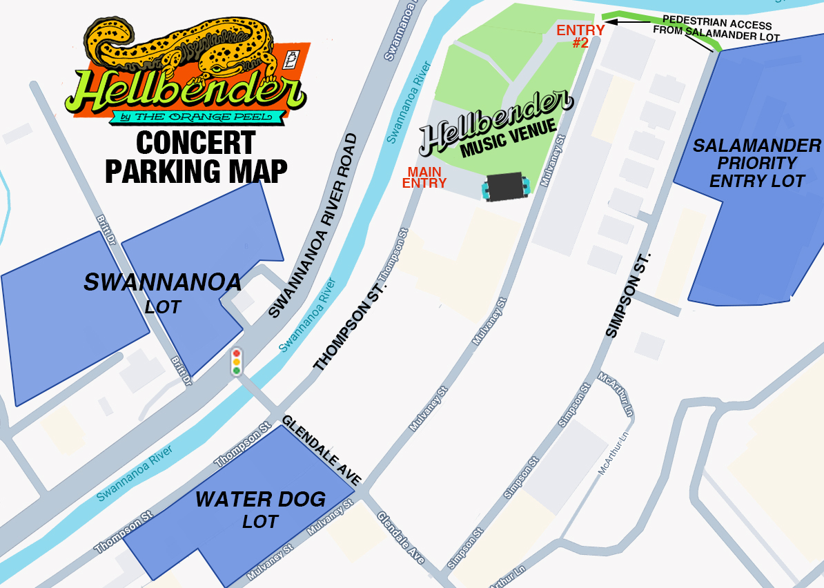 **There is NO street parking surrounding the venue on Swannonoa River Road (NC81), Thompson St., Simpson Street, or Glendale Road. The City of Asheville will be actively enforcing no parking along shoulders throughout the area**